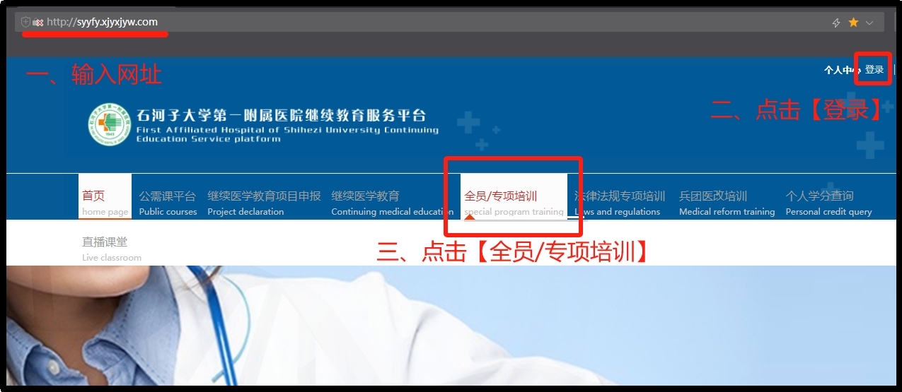 一、登录学习网址:http://syyfy.xjyxjyw.com/(石河子大学第一附属医院继续教育服务平台)—点击右上角登录,用户名为个人二代身份证号码,初始密码为:123456,新用户请注册后登陆—登录后点击【全员/专项培训】。