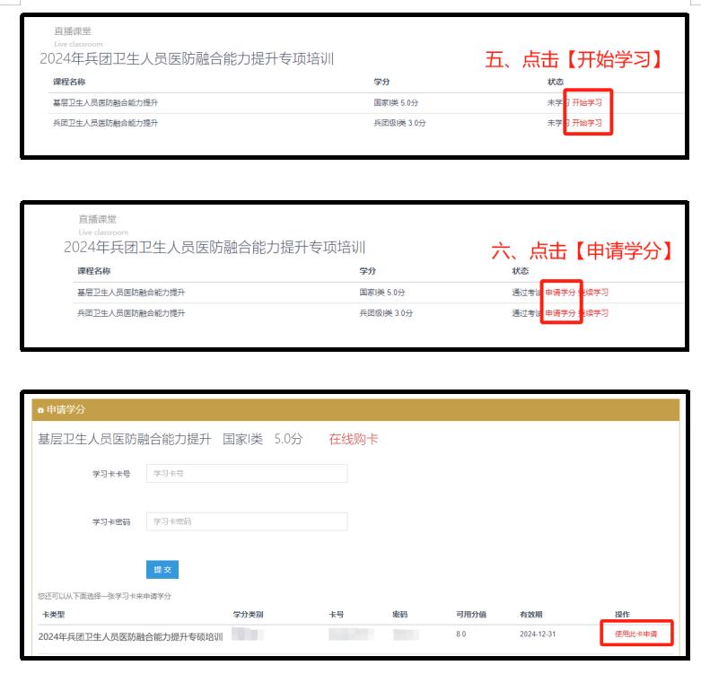二、选择【2024年兵团卫生人员医防融合能力提升专项培训】,点击【进入课程】学习完所有课件,考试完毕后,回到课程学习页面点击【申请学分】,(购卡成功后,学习卡的卡号和密码在【个人中心】-【我的学习卡】里查找),在申请学分页面选择之前购买的学习卡,点击【使用此卡申请】申请成功后,学分将在24小时后进入您的IC卡账户,24小时后查询学分即可。